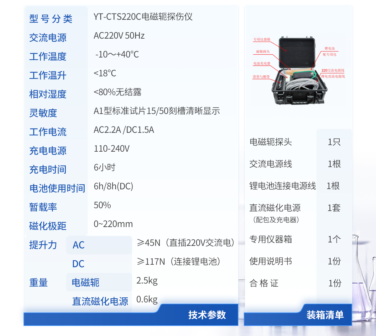 | 1.磁軛探頭1只 | 2.交流電源線1根 | 3.鋰電池連接電源線 1 根 | 4.直流磁化電源(配包及充電器) 1 套 | 5.專用儀器箱 1 個(gè) | 6.使用說(shuō)明書(shū) 1 份 | 7.合 格 證 1 份 |