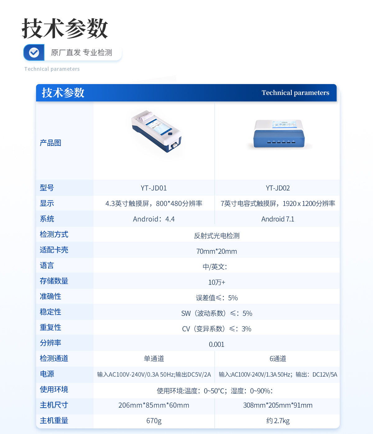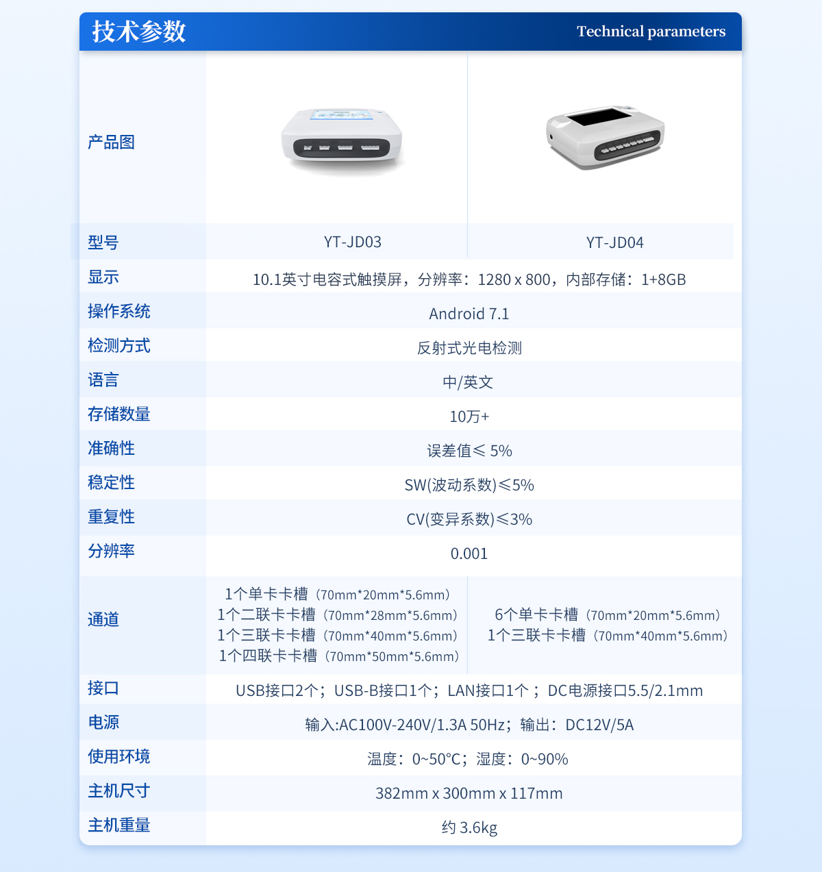 | 1、★ 10.1英寸電容式觸摸屏,分辨率:1280:x:800,內(nèi)部存儲:1+8GB | 2、 操作系統(tǒng):Android:7.1 | 3、 ★檢測方式:反射式光電 | 4、 語言:中/英文: | 5、 存儲數(shù)量:10萬+ | 6、 準確性:誤差值≤:5% | 7、 穩(wěn)定性:SW(波動系數(shù))≤5% | 8、 重復性:CV(變異系數(shù))≤3% | 9、 分辨率:0.001 | 10、 ★通道:1個單卡卡槽(70mm*20mm*5.6mm);1個二聯(lián)卡卡槽(70mm*28mm*5.6mm);1個三聯(lián)卡卡槽(70mm*40mm*5.6mm);1個四聯(lián)卡卡槽(70mm*50mm*5.6mm) | 11、 檢測時間:<:5秒:(單卡及多聯(lián)卡);可對樣本進行檢測。 | 12、 打印機:熱敏打印機(熱敏打印紙:57*30mm) | 13、 ★數(shù)據(jù)傳輸:WiFi、藍牙、USB、射頻讀卡、外置掃碼模塊(選配) | 14、 ★數(shù)據(jù)處理:可通過通訊端口進行數(shù)據(jù)匯總、上傳監(jiān)管平臺等 | 15、 ★檢測通道孵育檢測一體,溫度范圍::室溫:+5℃:~:60℃ | 16、 ★接口:USB接口:2個;USB-B接口:1個;LAN接口:1個:;DC電源接口:5.5/2.1mm | 17、 電源:輸入:AC:220V:±:20V,:50Hz:±:1Hz;輸出:DC:12V,:5A | 18、 使用環(huán)境:溫度:0~50℃;濕度:0~90%: | 19、 主機尺寸::382mm:x:300mm:x:117mm | 20、 主機重量:約:3.6kg |