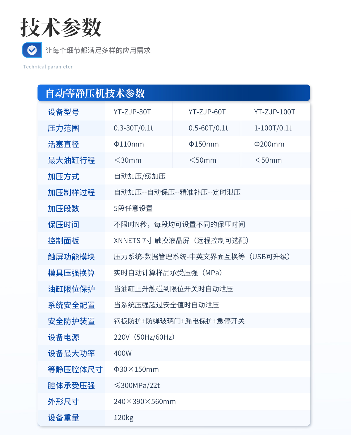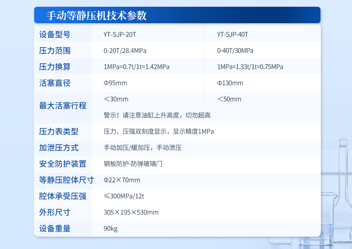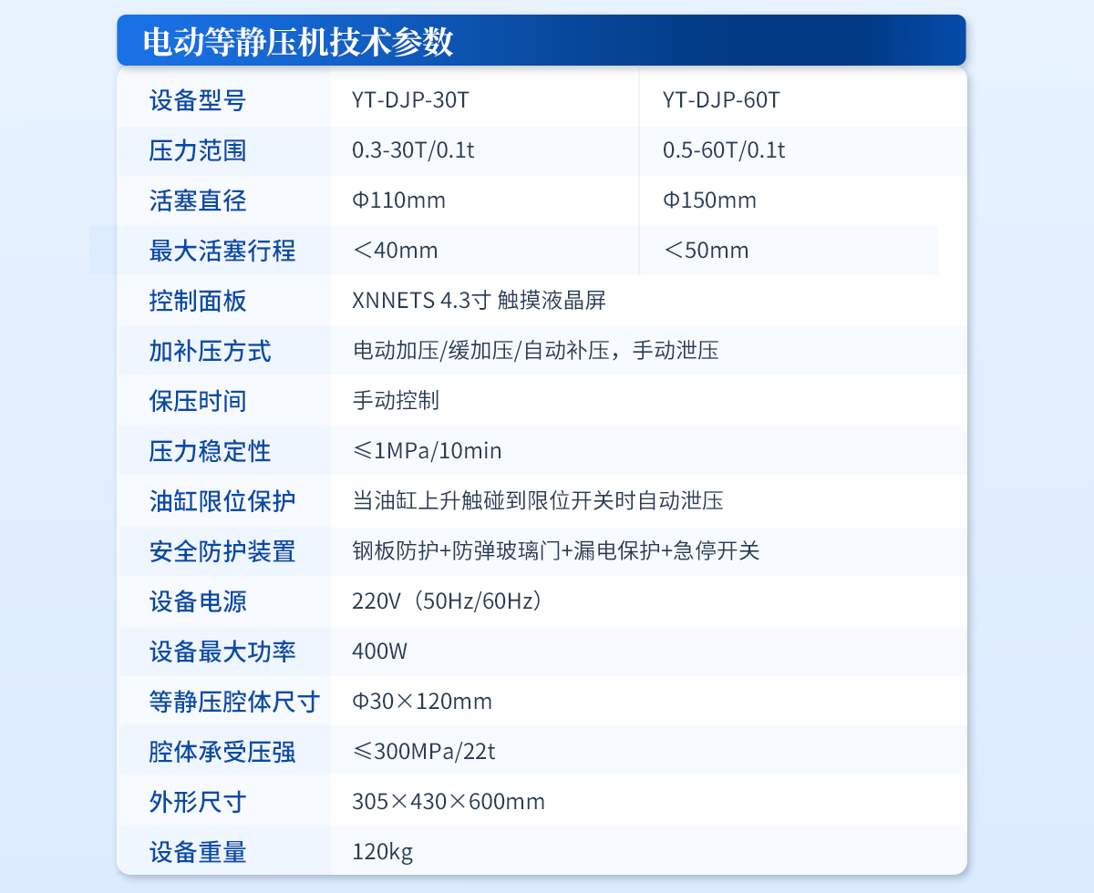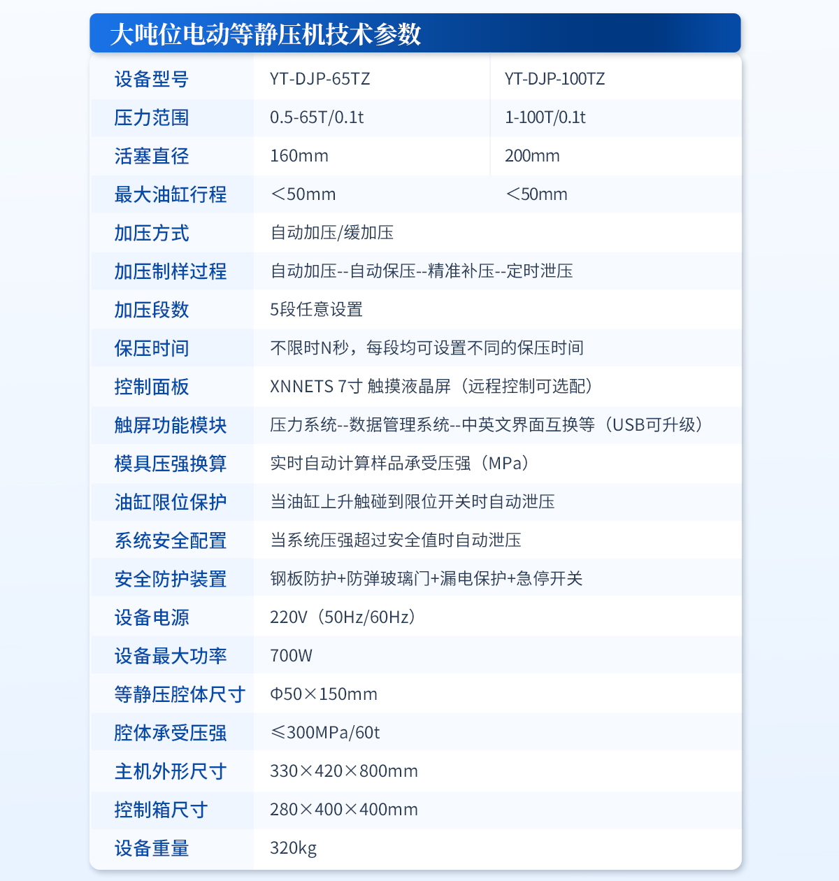 | 規(guī)格型號(hào):YT-DJP-60T | 壓力范圍:0.5-60T/0.1t | 活塞直徑 :Φ150mm | **油缸行程:<50mm | 控制面板:XNNETS 4.3寸 觸摸液晶屏 | 加補(bǔ)壓方式:電動(dòng)加壓/緩加壓/自動(dòng)補(bǔ)壓,手動(dòng)泄壓 | 保壓時(shí)間:手動(dòng)控制 | 壓力穩(wěn)定性:≤1MPa/10min | 油缸限位保護(hù):當(dāng)油缸上升觸碰到限位開關(guān)時(shí)自動(dòng)泄壓 | 安全防護(hù)裝置:鋼板防護(hù)+防彈玻璃門+漏電保護(hù)+急停開關(guān) | 設(shè)備電源:220V(50Hz/60Hz) | 設(shè)備**功率:400W | 等靜壓腔體尺寸:Φ50×150mm | 腔體承受壓強(qiáng):≤300MPa/60t | 外形尺寸: 405×470×720mm | 設(shè)備重量: 200kg | 配置說明:油壓機(jī)1臺(tái),等靜壓腔體1套!可根據(jù)需求定制500MPa等靜壓機(jī)或橡膠模具 |