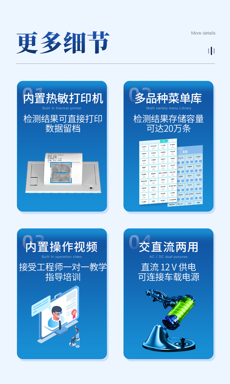 | 儀器采用手提式一體化系統(tǒng)檢測(cè)技術(shù),將分光光度模塊、新型農(nóng)殘檢測(cè)模塊、數(shù)字化管理模塊、無線通訊模塊高度集成于一體,支持檢測(cè)200種食品安全檢測(cè)項(xiàng)目,同時(shí)預(yù)留升級(jí)檢測(cè)方法。 | 儀器檢測(cè)模塊標(biāo)準(zhǔn)化、智能化,檢測(cè)項(xiàng)目可隨意自由組合。檢測(cè)箱體內(nèi)置多個(gè)標(biāo)準(zhǔn)檢測(cè)單元,檢測(cè)模塊可以調(diào)整配置。 | 顯示屏幕:儀器采用10.1英寸豎向液晶觸摸屏顯,搭配運(yùn)行安卓智能操作系統(tǒng),主控芯片采用ARM Cortex-A7,RK3288/4核處理器,主頻1.88Ghz,操作方便,性能更強(qiáng)。 | 檢測(cè)通道:≥12通道;采用精密旋轉(zhuǎn)比色池設(shè)計(jì),使用同芯片同光源校準(zhǔn)精度,解決不同光源之間的誤差值,更加準(zhǔn)確**。(1-12通道間誤差0.1%,***:**202022821055.2) | 儀器光源:高精度進(jìn)口四波長(zhǎng)冷光源,每個(gè)通道均配置 410、520、590、630nm 波長(zhǎng)光源,標(biāo)配**的光路切換裝置,專利光路切換功能可實(shí)現(xiàn)64波長(zhǎng),并且所有檢測(cè)項(xiàng)目可實(shí)現(xiàn)所有通道同時(shí)檢測(cè)。 | 設(shè)備可一鍵校準(zhǔn),自動(dòng)保存校準(zhǔn)數(shù)據(jù),自動(dòng)對(duì)比校驗(yàn),得到精準(zhǔn)光源,采用Android SP存儲(chǔ)數(shù)據(jù),光源數(shù)據(jù)永不丟失,方便每一次使用。 | 通訊接口:配備無線通信模塊、4G(APN)通訊模塊、藍(lán)牙傳輸,同時(shí)具有雙USB接口以及RJ45網(wǎng)線接口,可以多方式實(shí)現(xiàn)數(shù)據(jù)保存及數(shù)據(jù)傳輸 | 存儲(chǔ)方式:支持U盤存儲(chǔ),標(biāo)準(zhǔn)USB接口,免驅(qū)動(dòng)安裝。檢測(cè)結(jié)果存儲(chǔ)容量20萬條以上,可生成Excel表格進(jìn)行拷貝,并具有登錄保護(hù)功能。 | 智能化操作系統(tǒng): | 1)操作系統(tǒng):儀器可在同一檢測(cè)界面自動(dòng)對(duì)應(yīng)相關(guān)檢測(cè)通道,一次性選擇1-12個(gè)樣品名稱,無需退出界面,節(jié)省操作時(shí)間。并可以對(duì)每個(gè)通道屬性和樣品信息單獨(dú)進(jìn)行編輯,例如送檢單位、人員,檢測(cè)人員等,打印時(shí)勾選打印顯示。 | 2)數(shù)據(jù)集成系統(tǒng):設(shè)備首頁自動(dòng)匯總分析檢測(cè)數(shù)據(jù),包含:周檢測(cè)數(shù)據(jù)、月檢測(cè)數(shù)據(jù),全部檢測(cè)總數(shù)量,均包含檢測(cè)總數(shù),合格數(shù),不合格數(shù),以及相關(guān)柱形分析圖,各項(xiàng)檢測(cè)數(shù)據(jù)一目了然,無需電腦查詢,更加快捷直觀。 | 3)數(shù)據(jù)庫系統(tǒng):十幾項(xiàng)數(shù)據(jù)庫分類管理儀器:包含項(xiàng)目類型、項(xiàng)目數(shù)據(jù)、檢測(cè)數(shù)據(jù)、歷史記錄、國(guó)標(biāo)信息、曲線信息、采樣信息、檢測(cè)信息、受檢信息、復(fù)核信息、圖表信息、光源校準(zhǔn)信息、打印樣式信息、樣品庫信息等等,數(shù)據(jù)庫之間互相協(xié)調(diào)聯(lián)動(dòng)保證數(shù)據(jù)的真實(shí)完整性。同時(shí)產(chǎn)品數(shù)據(jù)庫以及歷史檢測(cè)記錄支持一鍵檢索功能。 | 4)限量規(guī)判系統(tǒng):具有限量查詢、添加物質(zhì)合規(guī)判定系統(tǒng)。檢測(cè)出結(jié)果后,系統(tǒng)自動(dòng)調(diào)用系統(tǒng)數(shù)據(jù)庫中相關(guān)國(guó)標(biāo)進(jìn)行比對(duì)判定,客觀顯示判定結(jié)果是否合格。 | 5)項(xiàng)目預(yù)設(shè)系統(tǒng):儀器具有任務(wù)預(yù)設(shè)模塊,一鍵提前預(yù)設(shè),給出方便快捷的新檢測(cè)方案,每一個(gè)任務(wù)分別可以設(shè)置不同的樣品、批次、編號(hào)、來源、備注、抽樣信息、檢測(cè)信息、受檢信息、復(fù)核信息等更多信息。樣品送檢時(shí)一鍵調(diào)取保存信息,并可多次調(diào)取,大大提高檢測(cè)效率。 | 6)數(shù)據(jù)監(jiān)管系統(tǒng):同步對(duì)接監(jiān)管平臺(tái),數(shù)據(jù)可局域網(wǎng)和互聯(lián)網(wǎng)數(shù)據(jù)上傳,檢測(cè)結(jié)果可選擇直接傳至食品安全監(jiān)管平臺(tái)。進(jìn)行區(qū)域食品安全監(jiān)管及大數(shù)據(jù)分析處理與數(shù)據(jù)統(tǒng)計(jì),檢測(cè)區(qū)域食品安全長(zhǎng)短期動(dòng)態(tài),達(dá)到食品安全問題預(yù)估、預(yù)警。 | 7)打印系統(tǒng):內(nèi)置全新打印機(jī),新創(chuàng)自定義打印方式,可按需靈活勾選控制:產(chǎn)品合格證(國(guó)家農(nóng)業(yè)部標(biāo)準(zhǔn)要求),二維碼,抽樣信息、檢測(cè)信息,受檢信息、復(fù)核信息、抽樣日期、檢測(cè)日期等信息的打印。 | 供電模式:儀器交直流兩用,直流12V供電,可連接車載電源,可配6ah大容量充電鋰電池,電量可實(shí)時(shí)顯示,方便戶外流動(dòng)測(cè)試。 | 膠體金檢測(cè)模塊:采用雙通道CMOS成像處理技術(shù)及膠體金免疫層析技術(shù),可同時(shí)讀取雙膠體金卡數(shù)據(jù),自動(dòng)采集、處理分析,將檢測(cè)結(jié)果顯示,并可根據(jù)參考限值自動(dòng)判斷檢測(cè)結(jié)果,可檢測(cè)常見的獸藥殘留、生物毒素、抗生素、違禁添加物等。 | 1)探測(cè)技術(shù):CMOS成像探測(cè); | 2)檢測(cè)通道:1個(gè)通道; | 3)檢測(cè)方式:消線法和比色法; | 4)顯示模式:陰性或陽性; | 5)曲線形式:軌道式掃描方式,顯示金標(biāo)卡圖像,實(shí)時(shí)生