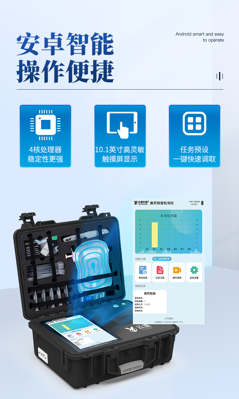 | 儀器采用手提一體化系統(tǒng)檢測(cè)技術(shù),將分光光度模塊、數(shù)字化管理模塊、無(wú)線通訊模塊高度集成于一體,可支持檢測(cè)60種食品安全檢測(cè)項(xiàng)目,同時(shí)預(yù)留升級(jí)檢測(cè)方法。 | 儀器檢測(cè)模塊標(biāo)準(zhǔn)化、智能化,檢測(cè)項(xiàng)目可隨意自由組合。檢測(cè)箱體內(nèi)置多個(gè)標(biāo)準(zhǔn)檢測(cè)單元,檢測(cè)模塊可以調(diào)整配置。 | 顯示屏幕:儀器采用10.1英寸豎向液晶觸摸屏顯,搭配運(yùn)行安卓智能操作系統(tǒng),主控芯片采用ARM Cortex-A7,RK3288/4核處理器,主頻1.88Ghz,操作方便,性能更強(qiáng)。 | 檢測(cè)通道:≥12通道;采用精密旋轉(zhuǎn)比色池設(shè)計(jì),使用同芯片同光源校準(zhǔn)精度,解決不同光源之間的誤差值,更加準(zhǔn)確**。(1-12通道間誤差0.1%,***:**202022821055.2) | 儀器光源:高精度進(jìn)口四波長(zhǎng)冷光源,每個(gè)通道均配置 410、520、590、630nm 波長(zhǎng)光源,標(biāo)配**的光路切換裝置,專利光路切換功能可實(shí)現(xiàn)64波長(zhǎng),并且所有檢測(cè)項(xiàng)目可實(shí)現(xiàn)所有通道同時(shí)檢測(cè)。 | 設(shè)備可一鍵校準(zhǔn),自動(dòng)保存校準(zhǔn)數(shù)據(jù),自動(dòng)對(duì)比校驗(yàn),得到精準(zhǔn)光源,采用Android SP存儲(chǔ)數(shù)據(jù),光源數(shù)據(jù)永不丟失,方便每一次使用。 | 通訊接口:配備無(wú)線通信模塊、4G(APN)通訊模塊、藍(lán)牙傳輸,同時(shí)具有雙USB接口以及RJ45網(wǎng)線接口,可以多方式實(shí)現(xiàn)數(shù)據(jù)保存及數(shù)據(jù)傳輸。 | 存儲(chǔ)方式:支持U盤(pán)存儲(chǔ),標(biāo)準(zhǔn)USB接口,免驅(qū)動(dòng)安裝。檢測(cè)結(jié)果存儲(chǔ)容量20萬(wàn)條以上,可生成Excel表格進(jìn)行拷貝,并具有登錄保護(hù)功能。 | 智能化操作系統(tǒng): | 1、操作系統(tǒng):儀器可在同一檢測(cè)界面自動(dòng)對(duì)應(yīng)相關(guān)檢測(cè)通道,一次性選擇1-12個(gè)樣品名稱,無(wú)需退出界面,節(jié)省操作時(shí)間。并可以對(duì)每個(gè)通道屬性和樣品信息單獨(dú)進(jìn)行編輯,例如送檢單位、人員,檢測(cè)人員等,打印時(shí)勾選打印顯示。 | 2、數(shù)據(jù)集成系統(tǒng):設(shè)備首頁(yè)自動(dòng)匯總分析檢測(cè)數(shù)據(jù),包含:周檢測(cè)數(shù)據(jù)、月檢測(cè)數(shù)據(jù),全部檢測(cè)總數(shù)量,均包含檢測(cè)總數(shù),合格數(shù),不合格數(shù),以及相關(guān)柱形分析圖,各項(xiàng)檢測(cè)數(shù)據(jù)一目了然,無(wú)需電腦查詢,更加快捷直觀。 | 3、數(shù)據(jù)庫(kù)系統(tǒng):十幾項(xiàng)數(shù)據(jù)庫(kù)分類管理儀器:包含項(xiàng)目類型、項(xiàng)目數(shù)據(jù)、檢測(cè)數(shù)據(jù)、歷史記錄、國(guó)標(biāo)信息、曲線信息、采樣信息、檢測(cè)信息、受檢信息、復(fù)核信息、圖表信息、光源校準(zhǔn)信息、打印樣式信息、樣品庫(kù)信息等等,數(shù)據(jù)庫(kù)之間互相協(xié)調(diào)聯(lián)動(dòng)保證數(shù)據(jù)的真實(shí)完整性。同時(shí)產(chǎn)品數(shù)據(jù)庫(kù)以及歷史檢測(cè)記錄支持一鍵檢索功能。 | 4、限量規(guī)判系統(tǒng):具有限量查詢、添加物質(zhì)合規(guī)判定系統(tǒng)。檢測(cè)出結(jié)果后,系統(tǒng)自動(dòng)調(diào)用系統(tǒng)數(shù)據(jù)庫(kù)中相關(guān)國(guó)標(biāo)進(jìn)行比對(duì)判定,客觀顯示判定結(jié)果是否合格。 | 5、項(xiàng)目預(yù)設(shè)系統(tǒng):儀器具有任務(wù)預(yù)設(shè)模塊,一鍵提前預(yù)設(shè),給出方便快捷的新檢測(cè)方案,每一個(gè)任務(wù)分別可以設(shè)置不同的樣品、批次、編號(hào)、來(lái)源、備注、抽樣信息、檢測(cè)信息、受檢信息、復(fù)核信息等更多信息。樣品送檢時(shí)一鍵調(diào)取保存信息,并可多次調(diào)取,大大提高檢測(cè)效率。 | 6、數(shù)據(jù)監(jiān)管系統(tǒng):同步對(duì)接監(jiān)管平臺(tái),數(shù)據(jù)可局域網(wǎng)和互聯(lián)網(wǎng)數(shù)據(jù)上傳,檢測(cè)結(jié)果可選擇直接傳至食品安全監(jiān)管平臺(tái)。進(jìn)行區(qū)域食品安全監(jiān)管及大數(shù)據(jù)分析處理與數(shù)據(jù)統(tǒng)計(jì),檢測(cè)區(qū)域食品安全長(zhǎng)短期動(dòng)態(tài),達(dá)到食品安全問(wèn)題預(yù)估、預(yù)警。 | 7.1、全新打印系統(tǒng):內(nèi)置全新打印機(jī),新創(chuàng)自定義打印方式,可按需靈活勾選控制:二維碼,抽樣信息、檢測(cè)信息,受檢信息、復(fù)核信息、抽樣日期、檢測(cè)日期等信息的打印。 | 7.2、A4紙版本報(bào)告打印功能(可選配):設(shè)備擁有兩種結(jié)果展示方式,可以自動(dòng)生成A4打印模板和小票打印模板兩種樣式,可通過(guò)WiFi及網(wǎng)線等方式鏈接外置打印機(jī)可進(jìn)行打印。 | 供電模式:儀器交直流兩用,直流12V供電,可連接車(chē)載電源,可配6ah大容量充電鋰電池,電量可實(shí)時(shí)顯示,方便戶外流動(dòng)測(cè)試。 | 儀器具備遠(yuǎn)程升級(jí)功能,可定向分客戶分儀器更新,開(kāi)機(jī)后自動(dòng)更新,并可持續(xù)性免費(fèi)更新系統(tǒng)版本,無(wú)需像傳統(tǒng)產(chǎn)品返廠更新,節(jié)省時(shí)間及人力成本并避免了物流運(yùn)輸返廠升級(jí)導(dǎo)致設(shè)備損壞的潛在風(fēng)險(xiǎn)。 |