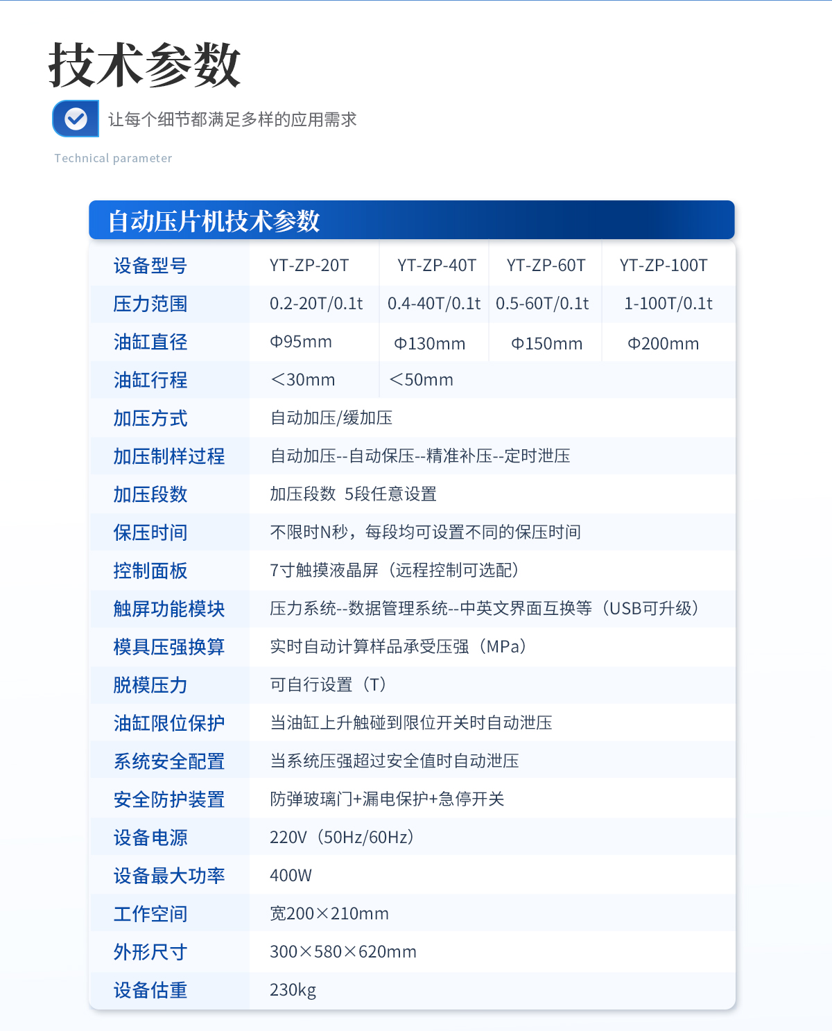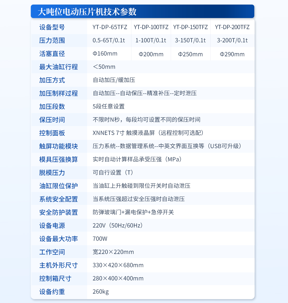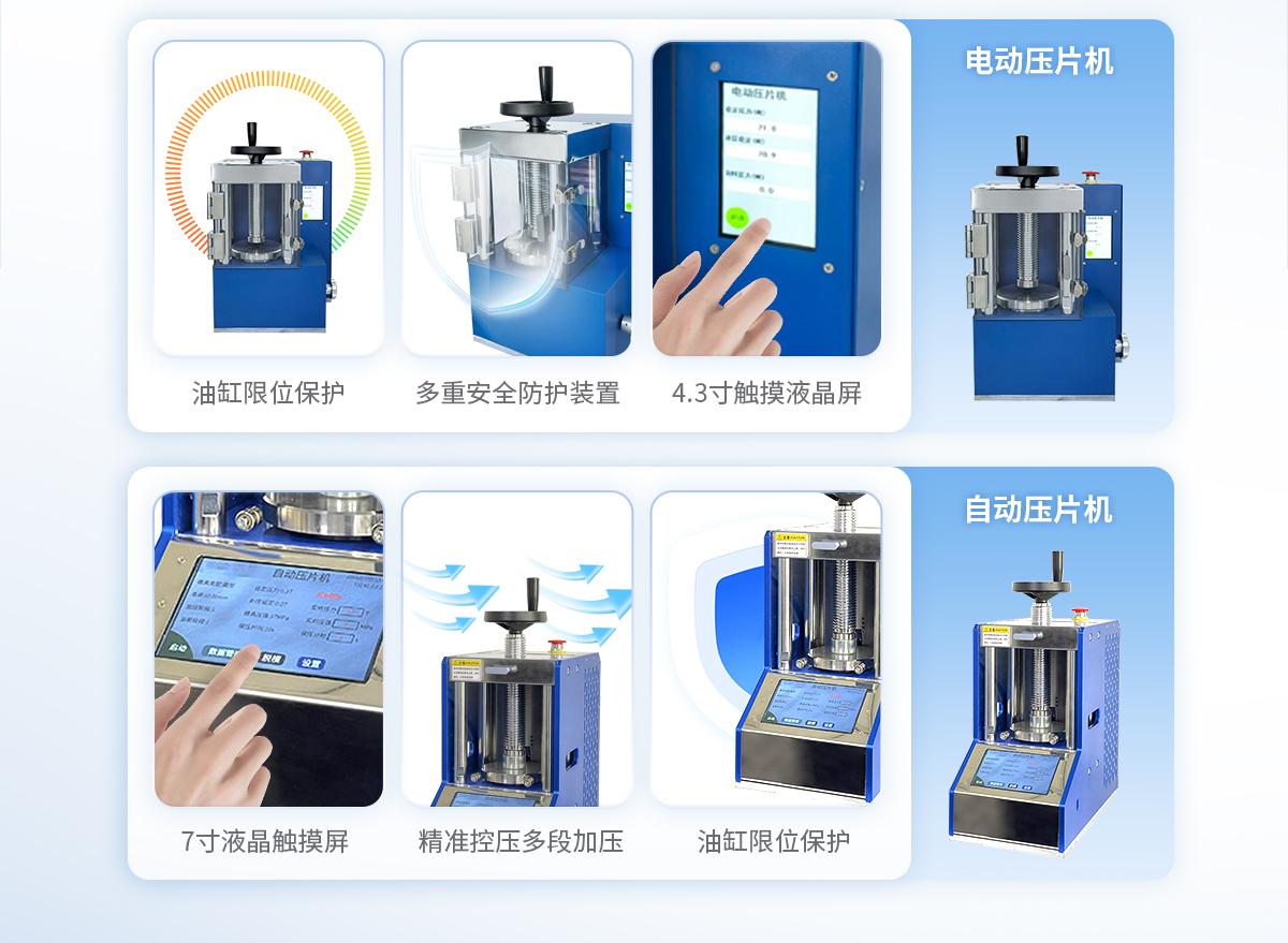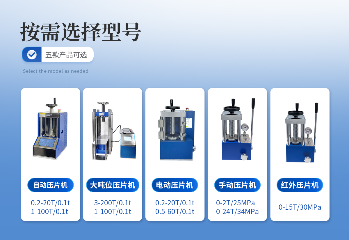 該機采用四立柱設計,配上特定模具,可與鈣鐵分析,紅外光譜(IR), X熒光(XRF)等分析儀配套使用;廣泛應用于超導、電池、粉末冶金、**陶瓷、建材水泥、化工制藥等研發(fā)領域。