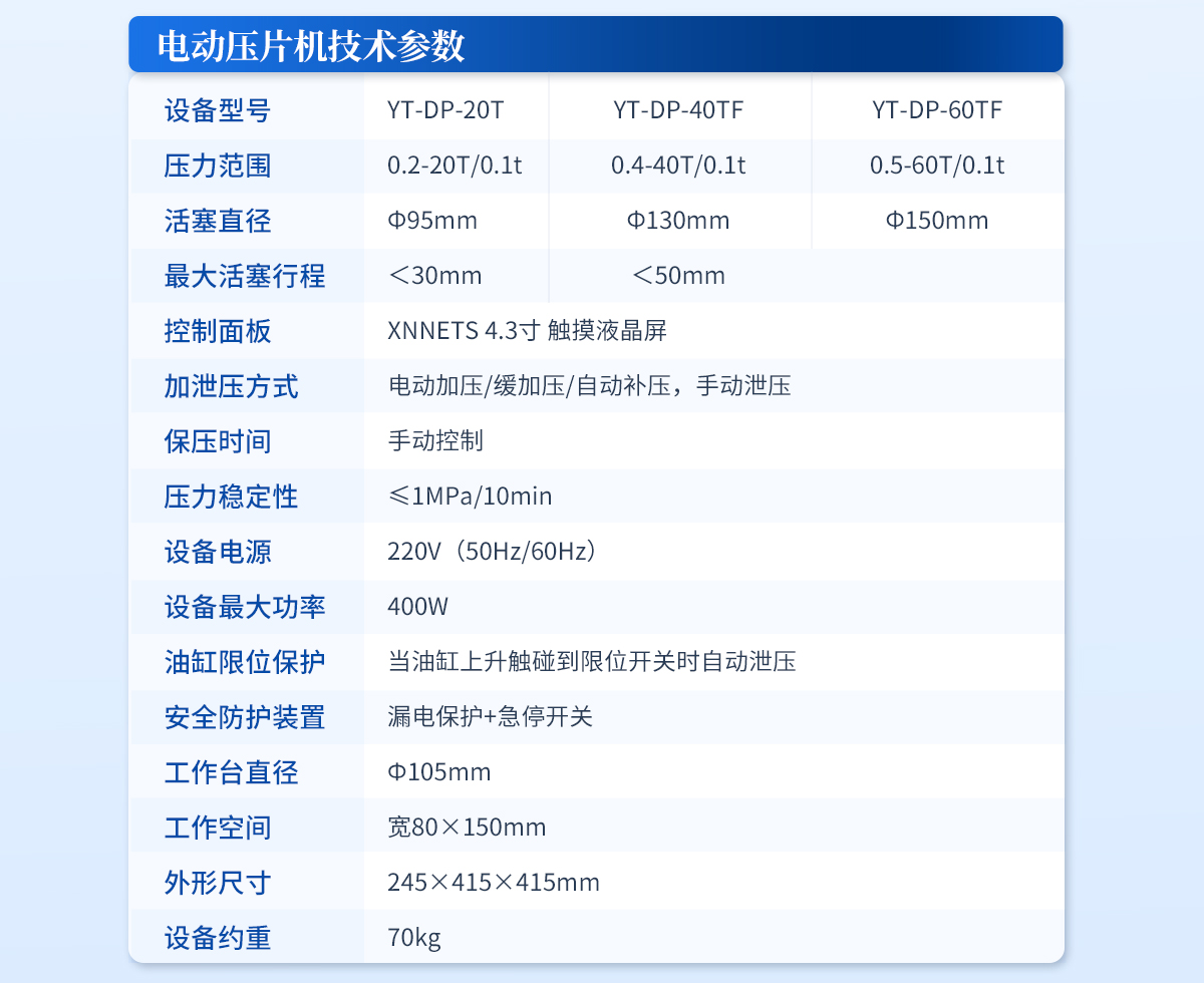 | 設備型號:YT-SP-15TB | 壓力范圍:0-15T/30MPa | 壓力換算:1MPa=0.5t/1t=2MPa | 活塞直徑 :Ф80mm | **活塞行程:<30mm 警示!請注意油缸上升高度,切勿超高 | 壓力表類型:壓力、壓強雙刻度顯示,顯示精度1MPa | 加泄壓方式:手動加壓/緩加壓,手動泄壓 | 壓力穩(wěn)定性:≤1MPa/10min | 工作臺直徑:Φ90mm | 工作空間 :寬80×150mm | 外形尺寸 :250×180×420mm | 設備重量 :約42kg | 配置說明:壓片機1臺,模具選配,可根據需求定制壓片機或模具 |