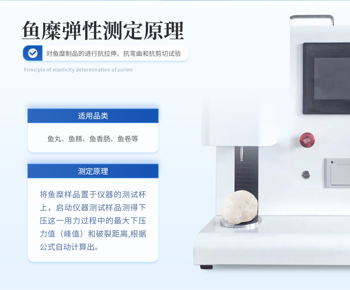 魚(yú)糜彈性測(cè)定儀是適用于各種魚(yú)丸、魚(yú)糕、魚(yú)香腸、魚(yú)卷等魚(yú)糜彈性的測(cè)試儀器。該機(jī)也叫質(zhì)構(gòu)儀,魚(yú)糜物性測(cè)試儀,魚(yú)糜凝膠強(qiáng)度測(cè)試儀 魚(yú)糜系以魚(yú)肉為原料,將魚(yú)肉粉碎,加食鹽、副原料等進(jìn)行擂潰,成粘稠的魚(yú)肉糊再成型后加熱,變成具有彈性的凝膠體, 魚(yú)糜彈性對(duì)一定形狀和尺寸魚(yú)糜制品的進(jìn)行抗拉伸、抗彎曲和抗剪切試驗(yàn),衡量魚(yú)糜質(zhì)量的一項(xiàng)重要指標(biāo)。 魚(yú)糜彈性測(cè)定儀滿足國(guó)家標(biāo)準(zhǔn)《GBT36187-2018冷凍魚(yú)糜凝膠強(qiáng)度測(cè)定》