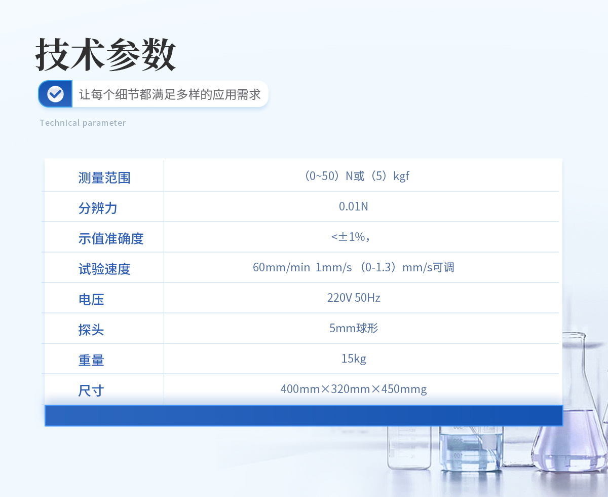 | 測(cè)量范圍:(0~50)N或(5)kgf | 分辨力:0.01N | 示值準(zhǔn)確度:<±1% | 試驗(yàn)速度:60mm/min 1mm/s (0-1.3)mm/s可調(diào) | 電壓:220V 50Hz | 探頭:5mm球形 | 單位:g.cm | 重量:15kg | 尺寸:400mm×320mm×450mm |