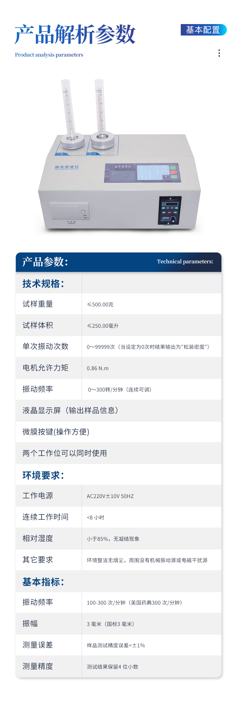 | 試樣重量:≤500.00克; | 試樣體積:≤250.00毫升; | 單次振動次數(shù):0~99999次(當(dāng)設(shè)定為0次時(shí)結(jié)果輸出為"松裝密度"); | 電機(jī)允許力矩:0.86 N.m; | 振動頻率: 0~300轉(zhuǎn)/分鐘(連續(xù)可調(diào)); | 液晶顯示屏(輸出樣品信息); | 微膜按鍵(操作方便) | 兩個(gè)工作位可以同時(shí)使用 | 振動幅度:3mm,(可調(diào)) | ZS2高精度振實(shí)密度儀是專門針對固體粉體密度的測量儀器,按照國家標(biāo)準(zhǔn)GB/T 5162-2006/ISO3953:1993,參照美國藥典標(biāo)準(zhǔn)研發(fā)制造。廣泛應(yīng)用于工業(yè)、電池材料、藥品材料、奶制品、磨料、造紙、水泥、涂料、科研機(jī)構(gòu)、大中專院校以及各種金屬和非金屬行業(yè)。 |