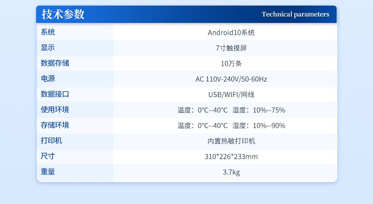 | 系統(tǒng):Android10系統(tǒng) | 顯示:7寸觸摸屏 | 數(shù)據(jù)存儲(chǔ):10萬(wàn)條 | 電源:AC 110V-240V/50-60Hz | 數(shù)據(jù)接口:USB/WIFI/網(wǎng)線(xiàn) | 使用環(huán)境:溫度:0℃--40℃ 濕度:10%--75% | 存儲(chǔ)環(huán)境:溫度:0℃--40℃ 濕度:10%--90% | 打印機(jī):內(nèi)置熱敏打印機(jī) | 尺寸:310*226*233mm | 重量:3.7kg |