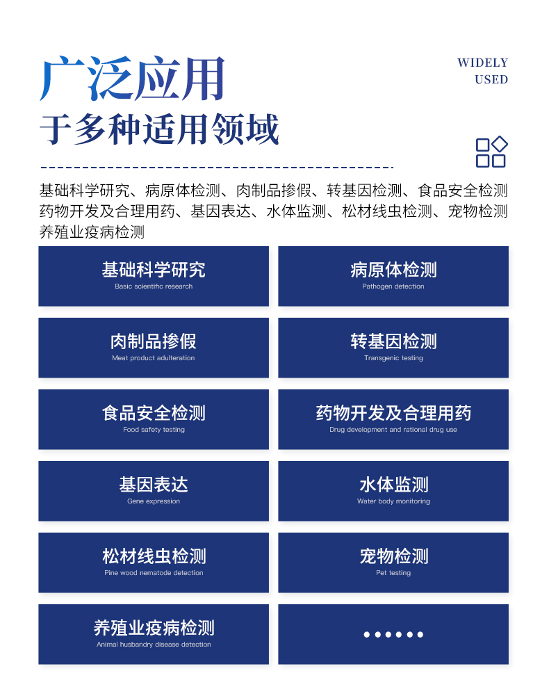 非洲豬瘟檢測儀配套非洲豬瘟病毒熒光pcr檢測試劑盒、非洲豬瘟病毒熒光pcr核酸檢測試劑盒均已經(jīng)獲得農(nóng)業(yè)農(nóng)村部產(chǎn)品批準,可以滿足非洲豬瘟核酸現(xiàn)場快速檢測需求。可定量快速畜牧類疾病診斷如非洲豬瘟、禽流感、豬瘟、豬藍耳、偽狂犬等疾病,廣泛應用于養(yǎng)殖場、屠宰場、食品加工廠、肉產(chǎn)品深加工企業(yè)、農(nóng)業(yè)農(nóng)村部、畜牧局、檢驗檢疫單位使用。