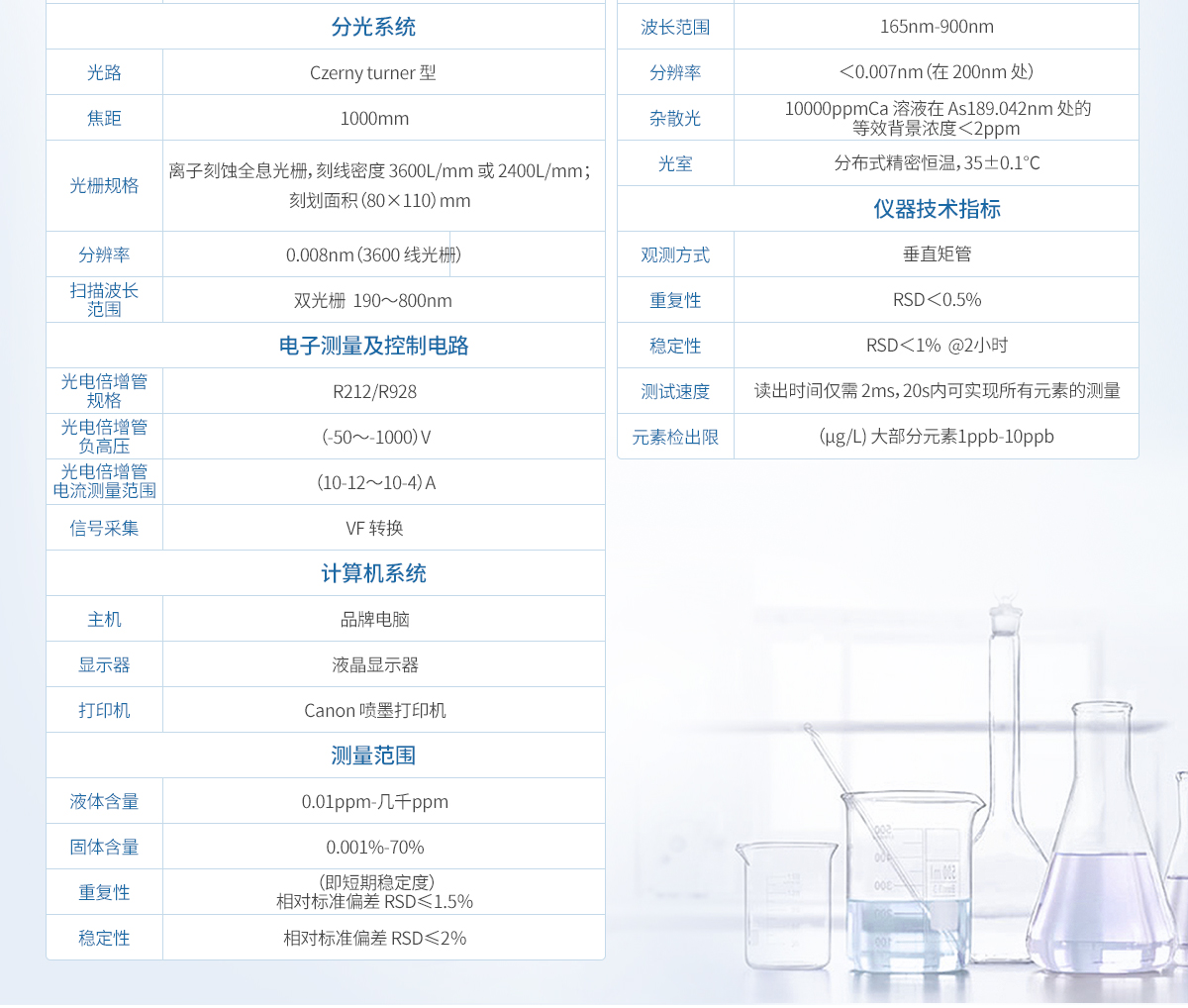 6、測量范圍 a.液體含量:0.01ppm-幾千 ppm b.固體含量:0.001%------70% 重復性:(即短期穩(wěn)定度)相對標準偏差 RSD≤1.5% 穩(wěn)定性:相對標準偏差 RSD≤2% 測試速度:5-10元素/每分鐘