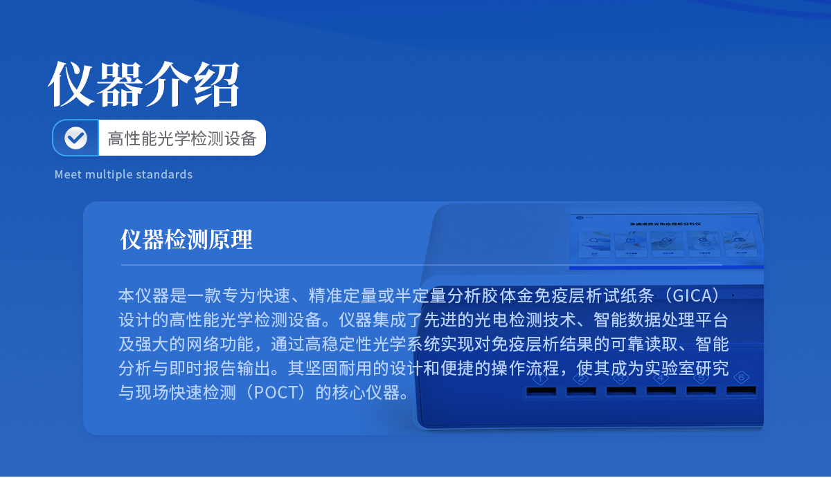 | 本儀器是一款專為快速、精準(zhǔn)定量或半定量分析膠體金免疫層析試紙條(GICA)設(shè)計(jì)的高性能光學(xué)檢測(cè)設(shè)備。儀器集成了**的光電檢測(cè)技術(shù)、智能數(shù)據(jù)處理平臺(tái)及強(qiáng)大的網(wǎng)絡(luò)功能,通過(guò)高穩(wěn)定性光學(xué)系統(tǒng)實(shí)現(xiàn)對(duì)免疫層析結(jié)果的可靠讀取、智能分析與即時(shí)報(bào)告輸出。其堅(jiān)固耐用的設(shè)計(jì)和便捷的操作流程,使其成為實(shí)驗(yàn)室研究與現(xiàn)場(chǎng)快速檢測(cè)(POCT)的核心儀器。 |