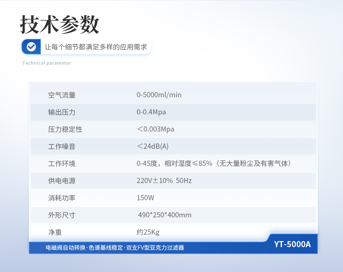 1、空氣流量: 0-5000ml/min 2、輸出壓力: 0-0.4Mpa 3、壓力穩(wěn)定性:<0.003Mpa 4、工作噪音: <24dB(A) 5、工作環(huán)境: 0-45度,相對濕度≤85%(無大量粉塵及有害氣體) 6、供電電源: 220V±10% 50Hz 7、消耗功率: 150W 8、外形尺寸: 490*250*400mm 9、凈重: 約25Kg
