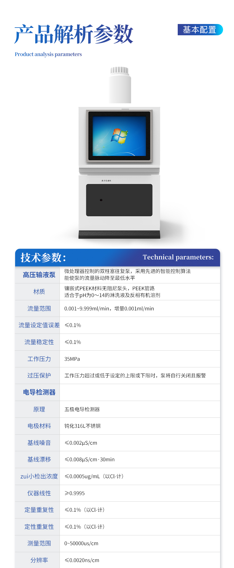 微處理器控制的雙柱塞往復泵,采用**的智能控制算法,能使泵的流量脈動降至**水平。 1.1,材質(zhì):鑲嵌式PEEK材料無阻尼泵頭,PEEK管路,適合于pH為0~14的淋洗液及反相有機溶劑。 1.2,流量范圍:0.001~9.999ml/min,增量0.001ml/min。 1.3,流量設定值誤差:≤0.1% 1.4,流量穩(wěn)定性:≤0.1% 1.5,工作壓力:35MPa 1.6,過壓保護:工作壓力超過或低于設定的上限或下限時,泵將自行關閉且報警。 | 2 電導檢測器: 2.1,原理:五極電導檢測器 2.2,電極材料:鈍化316L不銹鋼 2.3,基線噪音:≤0.002μS/cm 2.4,基線漂移:≤0.008μS/cm·30min 2.5,zui小檢出濃度:≤0.0005ug/mL(以Cl-計) 2.6,儀器線性:≥0.9995 2.7,定量重復性:≤0.1%(以Cl-計) 2.8,定性重復性:≤0.1%(以Cl-計) 2.9,測量范圍:0~50000us/cm 2.10,分辨率:≤0.0020ns/cm 2.11,檢測池體積:0.8uL 2.12,操作壓力:≤10Mpa。 2.13,電導檢測量程: 0-50000uS,10檔可調(diào)。 | 3、 陰、陽離子抑制器: 3.1連續(xù)自動再生電化學微膜抑制器,在線自動再生,高抑制容量,低背景電導,低噪聲,基線穩(wěn)定,免維護。 3.2抗污染,耐壓好,壽命長,使用范圍廣(PH0-14)。 3.3體積小,穩(wěn)定時間快,穩(wěn)定時間不大于12分鐘,且重現(xiàn)性好。 | 4 流路系統(tǒng): 4.1流路系統(tǒng)使用PEEK材料制造,通用性好,能使用強酸、強堿的淋洗液。 4.2百分之百的有機溶劑兼容,方便用戶對復雜樣品進行分析、沖洗和維護。 4.3 結構緊湊,流路*短,對流路造成的峰型擴展有很好的改善。 4.4 內(nèi)置多處漏液報警器和缺水報警器,全方位安全監(jiān)控。 | 5 內(nèi)置色譜工作站: 5.1 24位高精度高靈敏度數(shù)模轉換。 5.2專用離子色譜工作站,全中文顯示,通過USB方式與電腦進行數(shù)字信號傳輸,完成色譜數(shù)據(jù)采集及處理。 5.3自動接收分析和控制保存儀器色譜條件。 5.4自動識別負峰、基線扣除功能。自動積分參數(shù)、自動生成報告。 | 6 色譜柱、抑制器、電導池、放大電路一體恒溫系統(tǒng): 將電導池、流路系統(tǒng)、分離柱、抑制器、放大電路恒溫在同一個控溫基體上置于柱箱內(nèi),恒溫精度5~65℃±0.01℃。并且儀器柱箱采用絕熱結構,可保持檢測系統(tǒng)、流路及柱子、抑制器、電導池、放大電路的溫度恒定,獲得高質(zhì)量的分離效果和檢測精度,改善了電導檢測器的溫飄和基線噪聲。 | 7內(nèi)置淋洗液發(fā)生器,僅用高純水,無需人工配制任何化學試劑,在線產(chǎn)生等度或梯度高純淋洗液,減少基線漂移,提高穩(wěn)定性,簡化工作流程。 | 8 在線自動脫氣系統(tǒng): 1,脫氣效率:在25℃入口流動相的含氧量為8PPM時,出口流動相的含氧量為2PPM (流速:1.5ml\min) 2,真空壓力:-0.018MPa 3,流量:5mL/min | 9 分離能力:(分別配置不同的陰、陽離子分離柱,可以分離的離子種類:) 配置國產(chǎn)陰離子分離柱:一次進樣分析:氟化物、氯化物、亞硝酸鹽、磷酸鹽、溴化物、硝酸鹽、硫酸鹽 配置進口陰離子分離柱:一次進樣分析:氟化物、溴酸鹽、氯化物、亞硝酸鹽、磷酸鹽、溴化物、硝酸鹽、硫酸鹽、亞氯酸鹽、高氯酸鹽、二氯乙酸、三氯乙酸等 配置進口陽離子分離柱:一次進樣分析::Li+、Na+、NH4+、K+、Ca2+、Mg2+、Sr2+、Ba2+等 | 10 重量:30kg左右 尺寸mm:長500,寬400,高600 |