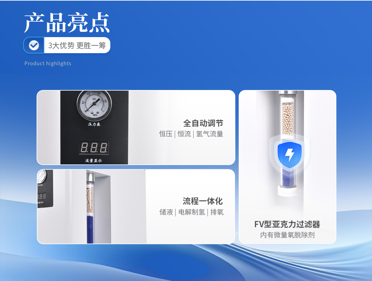 1、壓力、流量自動(dòng)顯示,自動(dòng)恒壓、恒流、氫氣流量可根據(jù)用量實(shí)現(xiàn)全自動(dòng)調(diào)節(jié)。 2、FV型亞克力過濾器,內(nèi)有微量氧脫除劑(不需要活化),氫氣純度更高;儀器內(nèi)部采用硅橡膠圈(含硫量低),有效提高氣體質(zhì)量,保證色譜基線平穩(wěn)。 3、儲(chǔ)液、電解制氫、排氧一體化,池溫低,壽命長(zhǎng)久。 4、配有安全裝置,靈敏可靠,自動(dòng)防返堿。