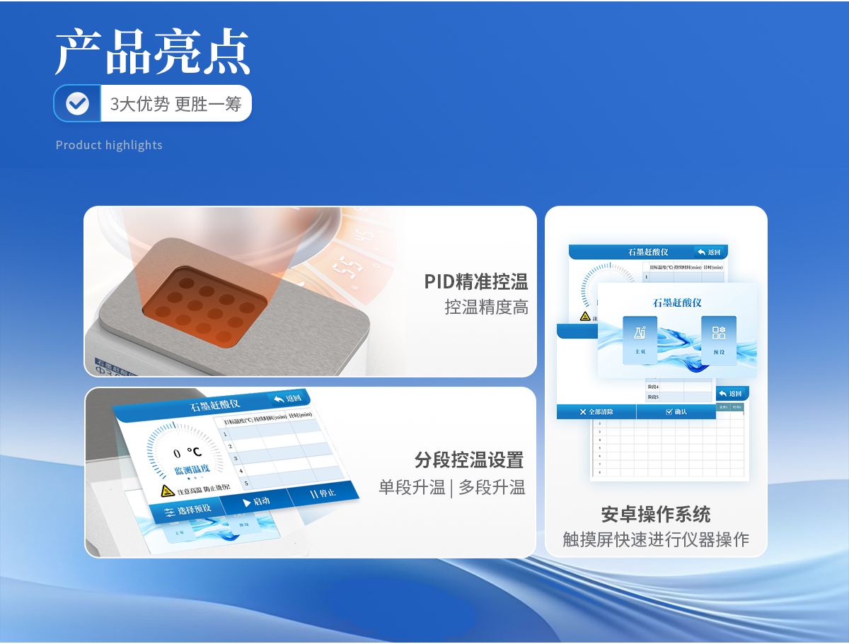 使用5寸彩色觸摸屏進行儀器操作,配備安卓操作系統(tǒng),方便快捷。 采用PID 控溫技術,控溫精度高,升溫速度快, 從室溫到260℃僅需25分鐘。 分段控溫設置,即可單段升溫,也可多段升溫,設置靈活,儀器將自動按順序完成。更適于易產生泡沫的樣品。 采用優(yōu)質石墨爐內芯,平均溫差較小,樣品效果一致性好,熱傳導效率更高。石墨塊具有特氟龍涂層,耐腐蝕,延長使用壽命。