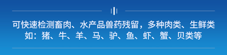 | 瘦肉精激素:鹽酸克倫特羅、沙丁胺醇、萊克多巴胺、己烯雌酚等 | 抗生素殘留:四環(huán)素類、硝基呋喃類、磺胺類、β-興奮劑類、沙星類、磺胺類、喹諾酮類,甲砜霉素,氟苯尼考,金剛烷胺、替米考星、慶大霉素、林可霉素、鏈霉素、恩諾沙星、環(huán)丙沙星、頭孢啦啶、青霉素、阿莫西林等 | 水產(chǎn)品安全類:孔雀石綠、氯霉素、呋喃妥因、呋喃西林、呋喃它酮、呋喃唑酮等 | 蛋類藥物殘留:氯霉素,四環(huán)素,磺胺類,喹諾酮類,呋喃西林,呋喃它酮,呋喃妥因,呋喃唑酮,氟苯尼考,阿莫西林、頭孢氨芐、紅霉素、鏈霉素等 | 動物疫病類:禽流感、新城疫、牛羊口蹄疫、牛羊結(jié)核病、牛羊包蟲、牛羊布病、小反芻獸、豬藍(lán)耳病毒、豬瘟病毒、豬偽狂犬病毒、豬細(xì)小、豬圓環(huán)、犬細(xì)小病毒、犬瘟熱病毒、犬狂犬病毒等 | 真菌毒素殘留:食用油、糧食及飼料中黃曲霉毒素B1、黃曲霉毒素總量,奶中黃曲霉毒素M1、嘔吐毒素、玉米赤霉烯酮、赭曲霉毒素A、T2毒素、伏馬毒素等 |