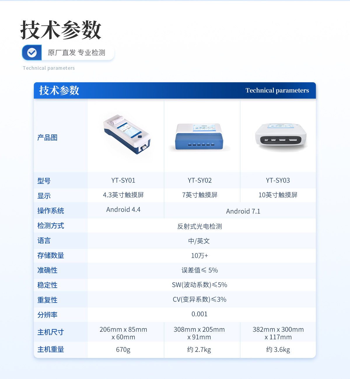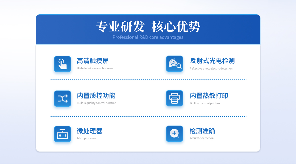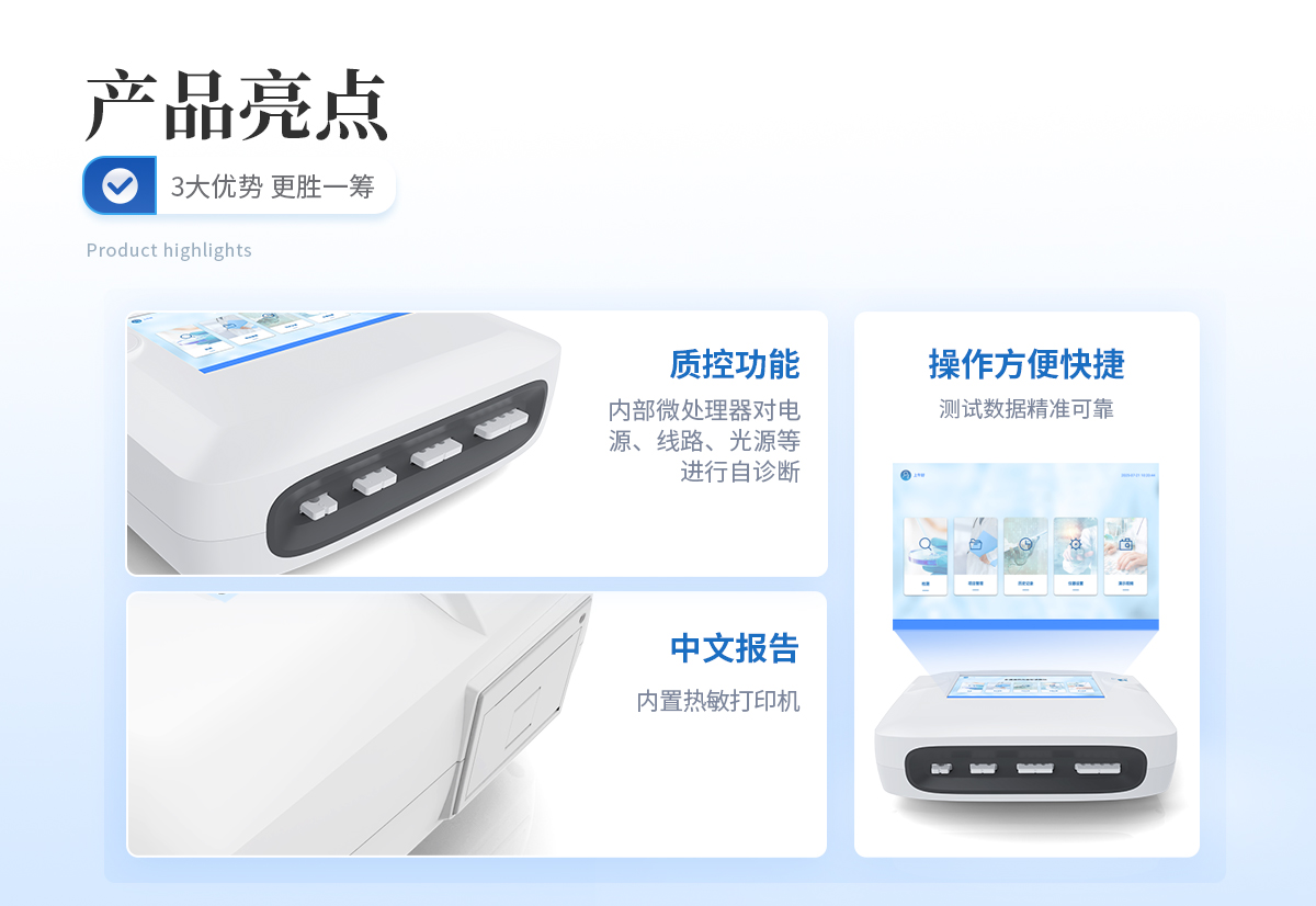 | 1、 Android觸控系統(tǒng)結(jié)合大尺寸高清屏幕,界面友好,操作簡單流暢,無需外接設(shè)備; | 2、 ★單卡+多聯(lián)卡設(shè)計(jì)方案,顯著提升檢測效率,滿足批量樣本快速處理需求; | 3、 可以500萬條檢測結(jié)果,支持按日期靈活查詢、預(yù)覽、刪除結(jié)果,并生成多樣化專業(yè)報(bào)告。 | 4、 內(nèi)置熱敏打印機(jī),檢測完成即可現(xiàn)場打印標(biāo)準(zhǔn)報(bào)告,提升工作效率。 | 5、 關(guān)鍵部件實(shí)時(shí)自診斷功能,保障儀器長期穩(wěn)定運(yùn)行。 | 6、 高速有線/無線網(wǎng)絡(luò)及藍(lán)牙,構(gòu)建完善的數(shù)據(jù)監(jiān)控平臺(tái),實(shí)現(xiàn)數(shù)據(jù)實(shí)時(shí)上傳、遠(yuǎn)程查詢、統(tǒng)計(jì)分析和監(jiān)管協(xié)同。 | 7、 豐富的接口設(shè)計(jì),輕松連接電腦、U盤、網(wǎng)絡(luò)及上位機(jī)系統(tǒng),支持U盤導(dǎo)出。 | 8、 孵育模塊為特定試紙條反應(yīng)提供**溫度環(huán)境。 | 9、 流線型結(jié)構(gòu),緊湊輕便,兼顧實(shí)驗(yàn)室耐用性與檢測需求。 | 10、 二維碼掃描錄入樣本信息,避免人工錯(cuò)誤。 | 11、 插卡判斷:檢測卡未插入檢測通道不能檢測 | 12、 內(nèi)置質(zhì)控功能,可設(shè)備送檢、設(shè)備自檢、試劑卡自檢 | 13、 檢測方式:孵育檢測、即時(shí)檢測(對(duì)檢測數(shù)據(jù)復(fù)檢核實(shí)) | 14、 檢測曲線:可以對(duì)試劑卡的檢測核驗(yàn),防止誤判 | 15、 檢測結(jié)果:報(bào)告出檢測項(xiàng)目、被測物質(zhì)的濃度、檢測單位、被檢查單位、檢驗(yàn)員、檢測時(shí)間、檢測限等信息可在觸摸屏上顯示,可通過儀器內(nèi)置打印機(jī)輸出 | 16、 項(xiàng)目管理:支持檢測項(xiàng)目拓展功能 | 17、 界面設(shè)置:可修改標(biāo)題和頁尾信息,靈活展示儀器信息 |
