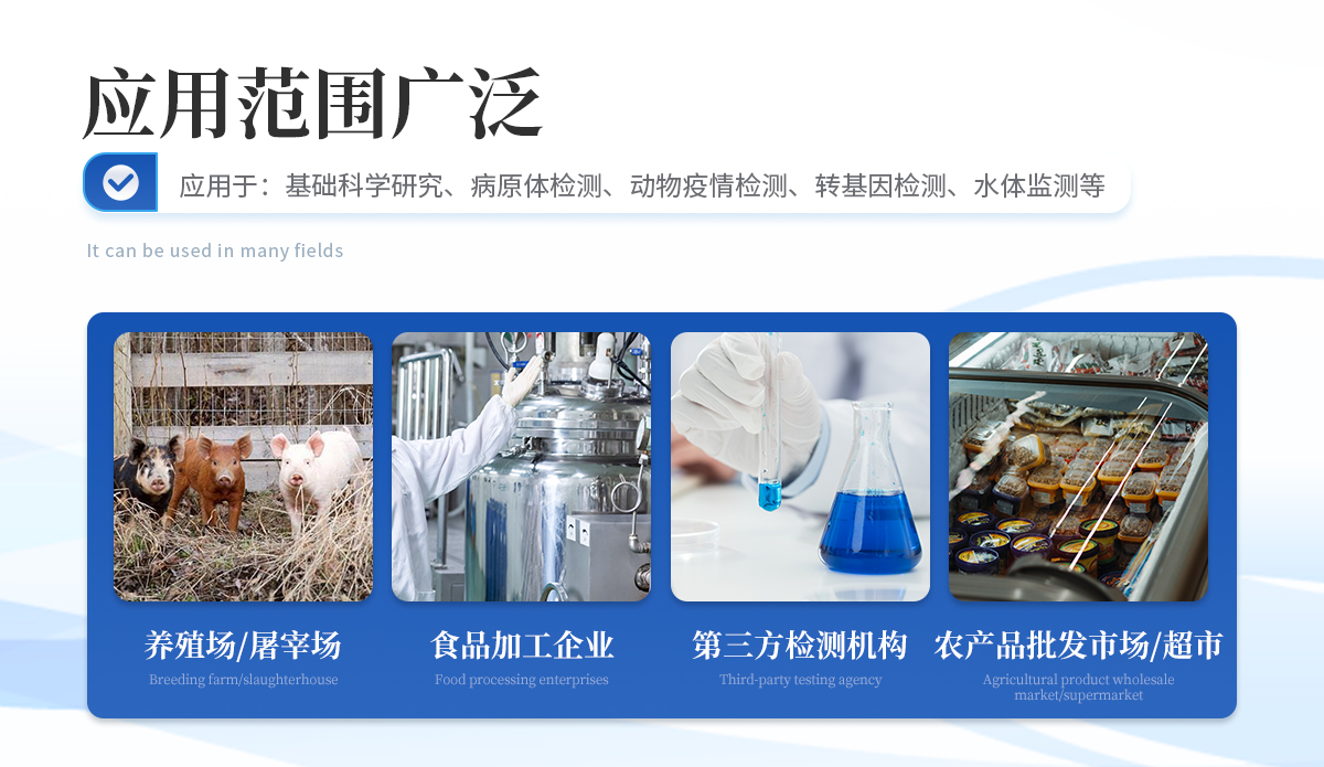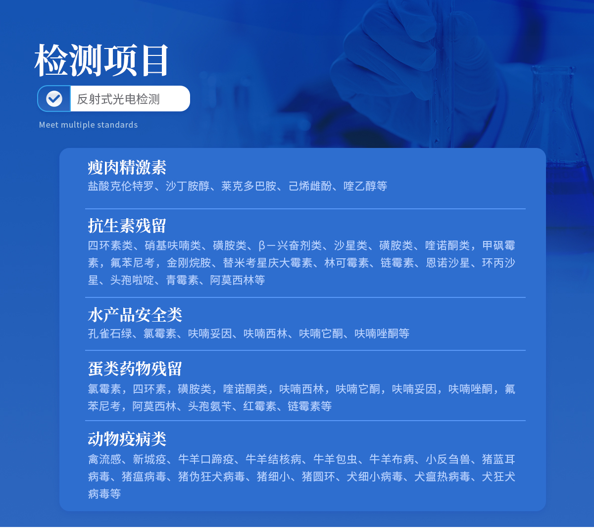 | 瘦肉精激素:鹽酸克倫特羅、沙丁胺醇、萊克多巴胺、己烯雌酚、喹乙醇等 | 抗生素殘留:四環(huán)素類、硝基呋喃類、磺胺類、β-興奮劑類、沙星類、磺胺類、喹諾酮類,甲砜霉素,氟苯尼考,金剛烷胺、替米考星、慶大霉素、林可霉素、鏈霉素、恩諾沙星、環(huán)丙沙星、頭孢啦啶、青霉素、阿莫西林等 | 水產(chǎn)品安全類:孔雀石綠、氯霉素、呋喃妥因、呋喃西林、呋喃它酮、呋喃唑酮等 | 蛋類藥物殘留 氯霉素,四環(huán)素,磺胺類,喹諾酮類,呋喃西林,呋喃它酮,呋喃妥因,呋喃唑酮,氟苯尼考,阿莫西林、頭孢氨芐、紅霉素、鏈霉素等 | 動(dòng)物疫病類:禽流感、新城疫、牛羊口蹄疫、牛羊結(jié)核病、牛羊包蟲、牛羊布病、小反芻獸、豬藍(lán)耳病毒、豬瘟病毒、豬偽狂犬病毒、豬細(xì)小、豬圓環(huán)、犬細(xì)小病毒、犬瘟熱病毒、犬狂犬病毒等 |