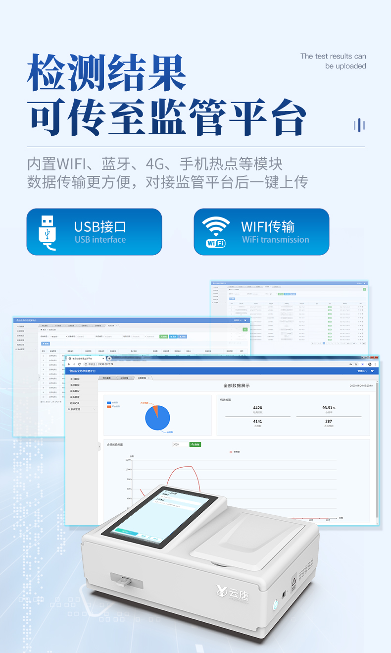 | 儀器采用手提一體化系統(tǒng)檢測(cè)技術(shù),將分光光度模塊、數(shù)字化管理模塊、無(wú)線通訊模塊高度集成于一體,可支持檢測(cè)60種食品安全檢測(cè)項(xiàng)目,同時(shí)預(yù)留升級(jí)檢測(cè)方法。 | 儀器檢測(cè)模塊標(biāo)準(zhǔn)化、智能化,檢測(cè)項(xiàng)目可隨意自由組合。檢測(cè)箱體內(nèi)置多個(gè)標(biāo)準(zhǔn)檢測(cè)單元,檢測(cè)模塊可以調(diào)整配置。 | 顯示屏幕:儀器采用10.1英寸豎向液晶觸摸屏顯,搭配運(yùn)行安卓智能操作系統(tǒng),主控芯片采用ARM Cortex-A7,RK3288/4核處理器,主頻1.88Ghz,操作方便,性能更強(qiáng)。 | 檢測(cè)通道:≥12通道;采用精密旋轉(zhuǎn)比色池設(shè)計(jì),使用同芯片同光源校準(zhǔn)精度,解決不同光源之間的誤差值,更加準(zhǔn)確**。(1-12通道間誤差0.1%,***:**202022821055.2) | 儀器光源:高精度進(jìn)口四波長(zhǎng)冷光源,每個(gè)通道均配置 410、520、590、630nm 波長(zhǎng)光源,標(biāo)配**的光路切換裝置,專利光路切換功能可實(shí)現(xiàn)64波長(zhǎng),并且所有檢測(cè)項(xiàng)目可實(shí)現(xiàn)所有通道同時(shí)檢測(cè)。 | 設(shè)備可一鍵校準(zhǔn),自動(dòng)保存校準(zhǔn)數(shù)據(jù),自動(dòng)對(duì)比校驗(yàn),得到精準(zhǔn)光源,采用Android SP存儲(chǔ)數(shù)據(jù),光源數(shù)據(jù)永不丟失,方便每一次使用。 | 通訊接口:配備無(wú)線通信模塊、4G(APN)通訊模塊、藍(lán)牙傳輸,同時(shí)具有雙USB接口以及RJ45網(wǎng)線接口,可以多方式實(shí)現(xiàn)數(shù)據(jù)保存及數(shù)據(jù)傳輸。 | 存儲(chǔ)方式:支持U盤(pán)存儲(chǔ),標(biāo)準(zhǔn)USB接口,免驅(qū)動(dòng)安裝。檢測(cè)結(jié)果存儲(chǔ)容量20萬(wàn)條以上,可生成Excel表格進(jìn)行拷貝,并具有登錄保護(hù)功能。 | 智能化操作系統(tǒng): | 1、操作系統(tǒng):儀器可在同一檢測(cè)界面自動(dòng)對(duì)應(yīng)相關(guān)檢測(cè)通道,一次性選擇1-12個(gè)樣品名稱,無(wú)需退出界面,節(jié)省操作時(shí)間。并可以對(duì)每個(gè)通道屬性和樣品信息單獨(dú)進(jìn)行編輯,例如送檢單位、人員,檢測(cè)人員等,打印時(shí)勾選打印顯示。 | 2、數(shù)據(jù)集成系統(tǒng):設(shè)備首頁(yè)自動(dòng)匯總分析檢測(cè)數(shù)據(jù),包含:周檢測(cè)數(shù)據(jù)、月檢測(cè)數(shù)據(jù),全部檢測(cè)總數(shù)量,均包含檢測(cè)總數(shù),合格數(shù),不合格數(shù),以及相關(guān)柱形分析圖,各項(xiàng)檢測(cè)數(shù)據(jù)一目了然,無(wú)需電腦查詢,更加快捷直觀。 | 3、數(shù)據(jù)庫(kù)系統(tǒng):十幾項(xiàng)數(shù)據(jù)庫(kù)分類管理儀器:包含項(xiàng)目類型、項(xiàng)目數(shù)據(jù)、檢測(cè)數(shù)據(jù)、歷史記錄、國(guó)標(biāo)信息、曲線信息、采樣信息、檢測(cè)信息、受檢信息、復(fù)核信息、圖表信息、光源校準(zhǔn)信息、打印樣式信息、樣品庫(kù)信息等等,數(shù)據(jù)庫(kù)之間互相協(xié)調(diào)聯(lián)動(dòng)保證數(shù)據(jù)的真實(shí)完整性。同時(shí)產(chǎn)品數(shù)據(jù)庫(kù)以及歷史檢測(cè)記錄支持一鍵檢索功能。 | 4、限量規(guī)判系統(tǒng):具有限量查詢、添加物質(zhì)合規(guī)判定系統(tǒng)。檢測(cè)出結(jié)果后,系統(tǒng)自動(dòng)調(diào)用系統(tǒng)數(shù)據(jù)庫(kù)中相關(guān)國(guó)標(biāo)進(jìn)行比對(duì)判定,客觀顯示判定結(jié)果是否合格。 | 5、項(xiàng)目預(yù)設(shè)系統(tǒng):儀器具有任務(wù)預(yù)設(shè)模塊,一鍵提前預(yù)設(shè),給出方便快捷的新檢測(cè)方案,每一個(gè)任務(wù)分別可以設(shè)置不同的樣品、批次、編號(hào)、來(lái)源、備注、抽樣信息、檢測(cè)信息、受檢信息、復(fù)核信息等更多信息。樣品送檢時(shí)一鍵調(diào)取保存信息,并可多次調(diào)取,大大提高檢測(cè)效率。 | 6、數(shù)據(jù)監(jiān)管系統(tǒng):同步對(duì)接監(jiān)管平臺(tái),數(shù)據(jù)可局域網(wǎng)和互聯(lián)網(wǎng)數(shù)據(jù)上傳,檢測(cè)結(jié)果可選擇直接傳至食品安全監(jiān)管平臺(tái)。進(jìn)行區(qū)域食品安全監(jiān)管及大數(shù)據(jù)分析處理與數(shù)據(jù)統(tǒng)計(jì),檢測(cè)區(qū)域食品安全長(zhǎng)短期動(dòng)態(tài),達(dá)到食品安全問(wèn)題預(yù)估、預(yù)警。 | 7.1、全新打印系統(tǒng):內(nèi)置全新打印機(jī),新創(chuàng)自定義打印方式,可按需靈活勾選控制:二維碼,抽樣信息、檢測(cè)信息,受檢信息、復(fù)核信息、抽樣日期、檢測(cè)日期等信息的打印。 | 7.2、A4紙版本報(bào)告打印功能(可選配):設(shè)備擁有兩種結(jié)果展示方式,可以自動(dòng)生成A4打印模板和小票打印模板兩種樣式,可通過(guò)WiFi及網(wǎng)線等方式鏈接外置打印機(jī)可進(jìn)行打印。 | 供電模式:儀器交直流兩用,直流12V供電,可連接車(chē)載電源,可配6ah大容量充電鋰電池,電量可實(shí)時(shí)顯示,方便戶外流動(dòng)測(cè)試。 | 儀器具備遠(yuǎn)程升級(jí)功能,可定向分客戶分儀器更新,開(kāi)機(jī)后自動(dòng)更新,并可持續(xù)性免費(fèi)更新系統(tǒng)版本,無(wú)需像傳統(tǒng)產(chǎn)品返廠更新,節(jié)省時(shí)間及人力成本并避免了物流運(yùn)輸返廠升級(jí)導(dǎo)致設(shè)備損壞的潛在風(fēng)險(xiǎn)。 |