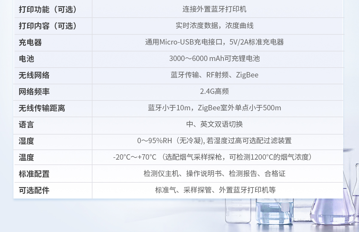 主機尺寸:(H x W x D)231*86*52mm 主機重量:約500克 測量氣體:揮發(fā)性有機物(VOC) 傳感器工作原理:光離子原理(PID); 氣體測量范圍 :0-20/100/200/2000/6000/10000ppm或其它量程 分辨率:0.001/0.01/0.1/1PPM 響應(yīng)時間 :T90<3S 示值誤差: ≤±3%F.S 泵流量:泵流量可調(diào),流量范圍:0~500 cc/Min或0~500mL/min 顯示屏:3.5寸彩色顯示屏(觸摸可選),分辨率480*320 顯示內(nèi)容:氣體分子式,測量值、計量單位、濃度實時曲線、電池電量、時間、報警信息,故障信息 報 警:蜂鳴器、紅色報警指示燈、LCD上的報警狀態(tài)提示、電池低電量報警等 數(shù)據(jù)記錄:獨立的SD存儲卡(可選):標配2G,選配6G、8G、16G、32G等 測量數(shù)據(jù)自動記錄功能,可自定義記錄時間間隔 通訊及數(shù)據(jù)下載 (可選):可直接通過USB連接電腦,快速下載存儲數(shù)據(jù)的TXT文檔; 下載、存儲、分析、打印數(shù)據(jù) 打印功能(可選):連接外置藍牙打印機 打印內(nèi)容(可選):實時濃度數(shù)據(jù), 濃度曲線 充電器:通用Micro-USB充電接口,5V/2A標準充電器 電池:3000~6000 mAh可充鋰電池 無線網(wǎng)絡(luò):藍牙傳輸、RF射頻、ZigBee 網(wǎng)絡(luò)頻率 :2.4G高頻 無線傳輸距離 :藍牙小于10m,ZigBee室外單點小于500m 語 言:中、英文雙語切換 濕 度:0~95%RH(無冷凝), 若濕度過高可選配過濾裝置 溫 度:-20℃~ +70℃ (選配煙氣采樣探槍,可檢測1200℃的煙氣濃度)
