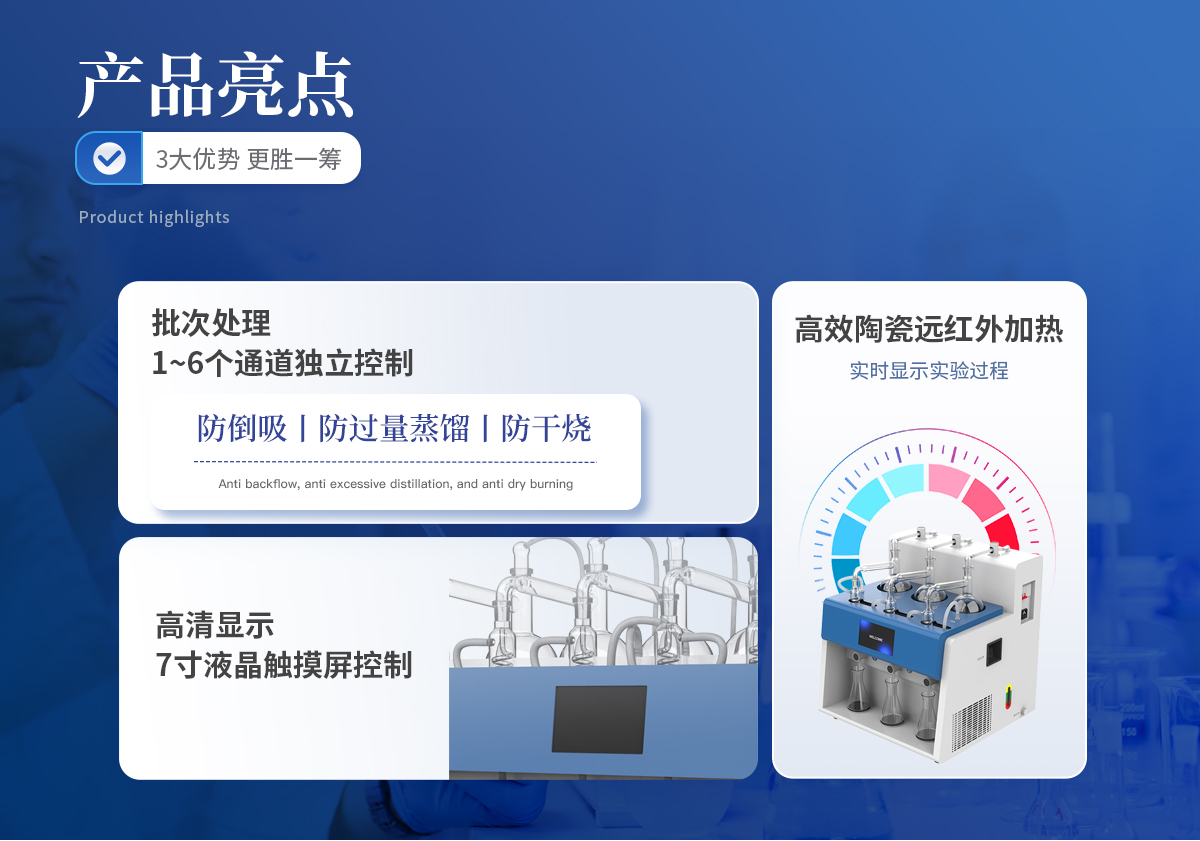 | 1、批次處理量為1~6個,每個通道均獨立控制,并且每個通道都配備了防倒吸、防過量蒸餾及防干燒的功能保護設計; | 2、采用7寸液晶觸摸屏控制,蒸餾方法可設置,自動保存,下次開機可直接使用;系統(tǒng)自帶校正蒸餾體積(重量)功能。 | 3、加熱模塊采用遠紅外陶瓷輻射加熱方式,碗狀加熱熱源設計,確保樣品容器(圓底燒瓶)與熱源密切貼合,加熱功率調節(jié)范圍廣、加熱均勻性好、熱輻射效率高,蒸餾速度快、使用壽命長。 | 4、采用系統(tǒng)可設置蒸餾量、蒸餾時間;實時顯示運行狀態(tài)、蒸餾量及剩余蒸餾時間。各蒸餾單元可單孔定時定量設置,獨立控制,單獨運行,蒸餾結束自動停止。 | 5、蒸餾終點控制采用時間和重量雙重模式,蒸餾結果到達重量或時間設定值后,自動停止加熱和切斷餾出液管路,自動泄壓,實現(xiàn)自動無人值守。 |